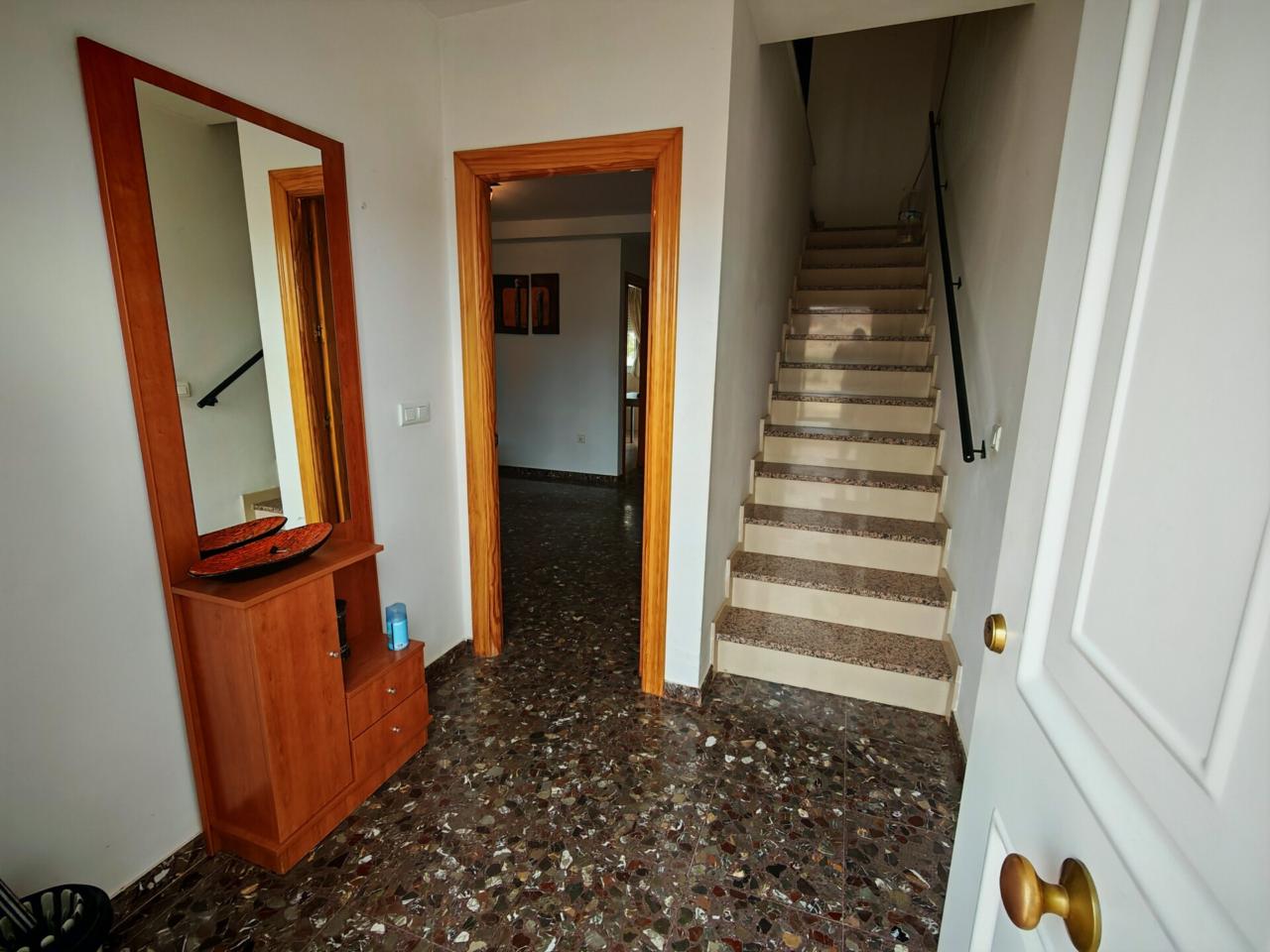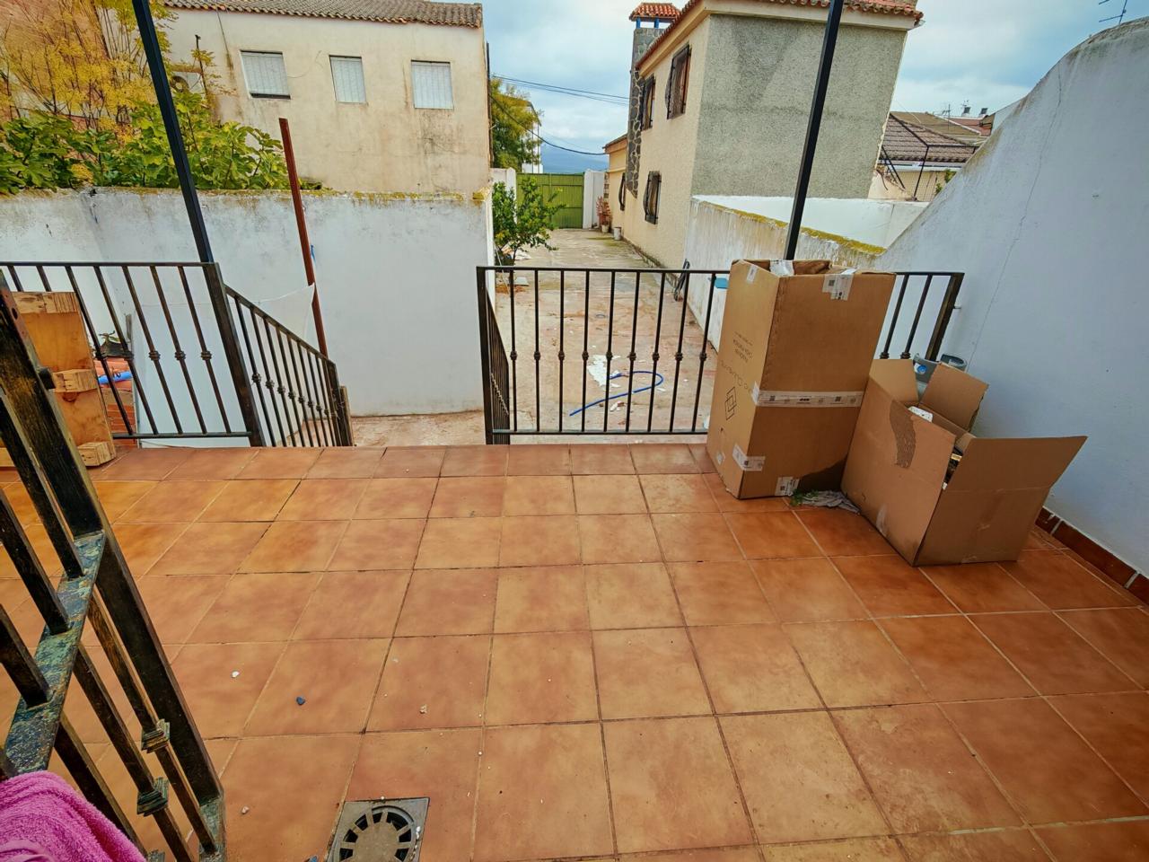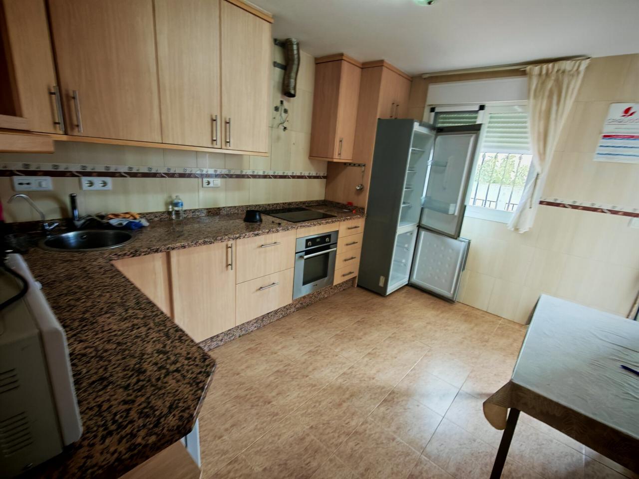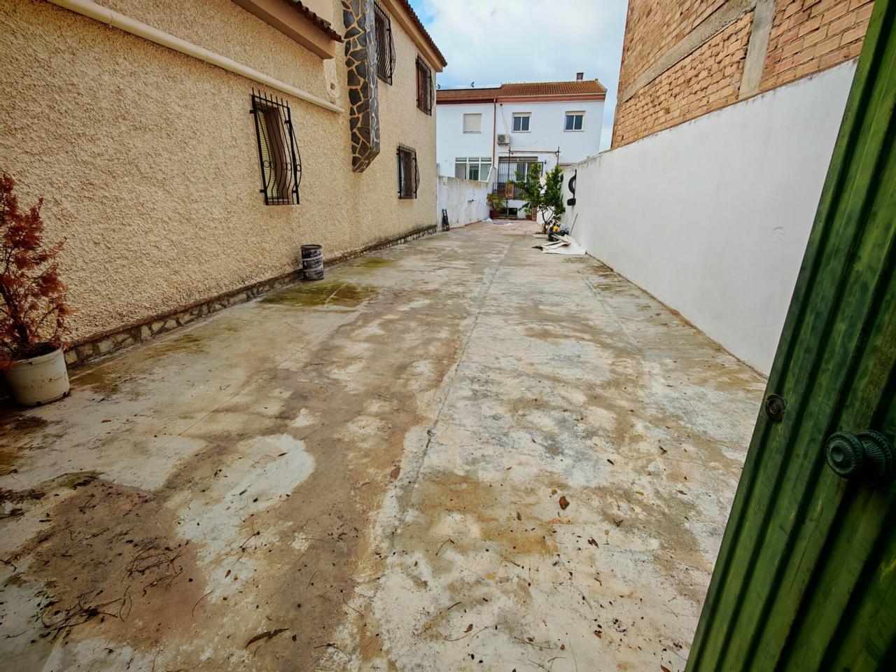 Ya en cuanto a la vivienda accedemos por porche delantero con terraza en la entrada, pasamos a recibidor con puerta separando el salon que cuenta con aire acondicionado y ventana frontal y con unas muy buenas dimensiones, junto al salon tenemos un baño completo con plato de ducha para la planta baja, puerta de acceso al semisotano y una amplia cocina amueblada y con encimera de granito y salida a lavadero que nos da acceso tambien a terraza y gran patio trasero que se prolonga hasta la carretera principal con porton de acceso.