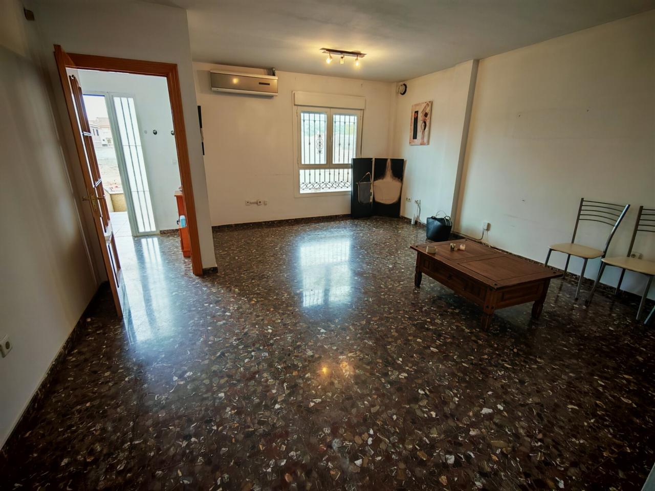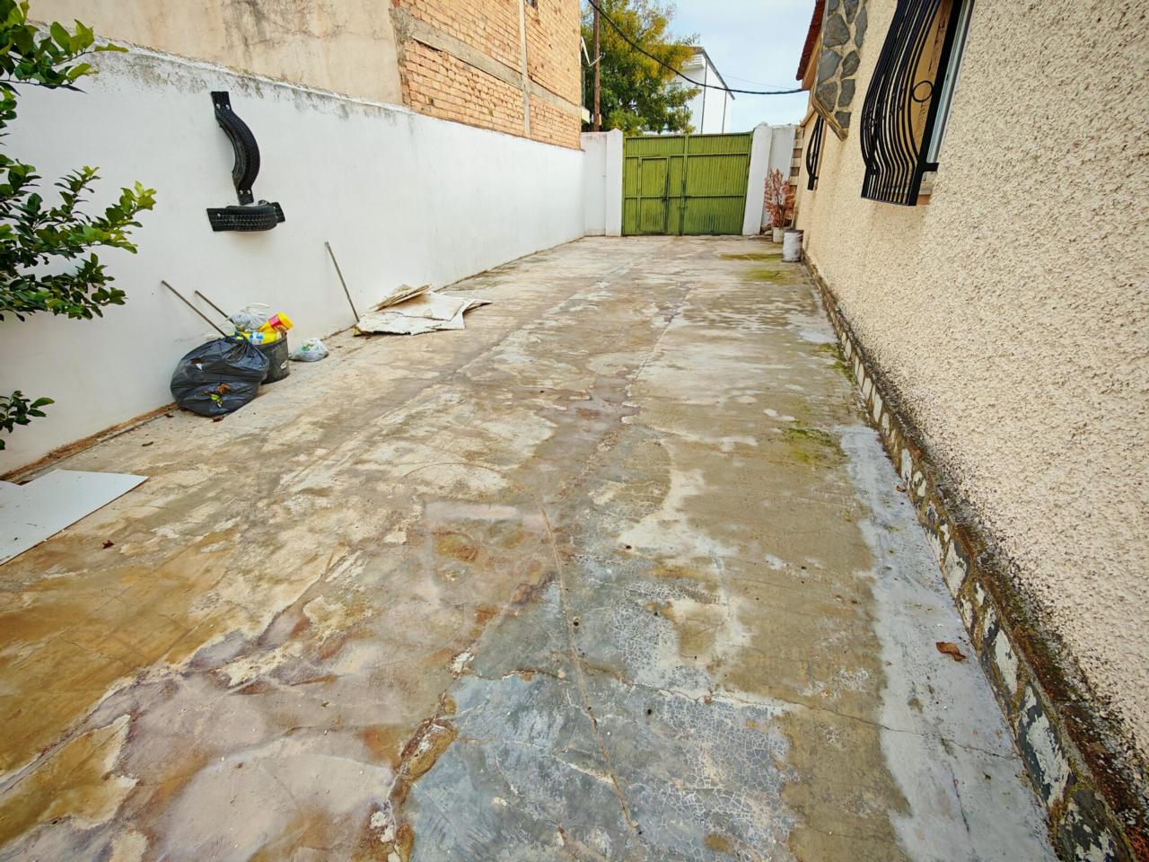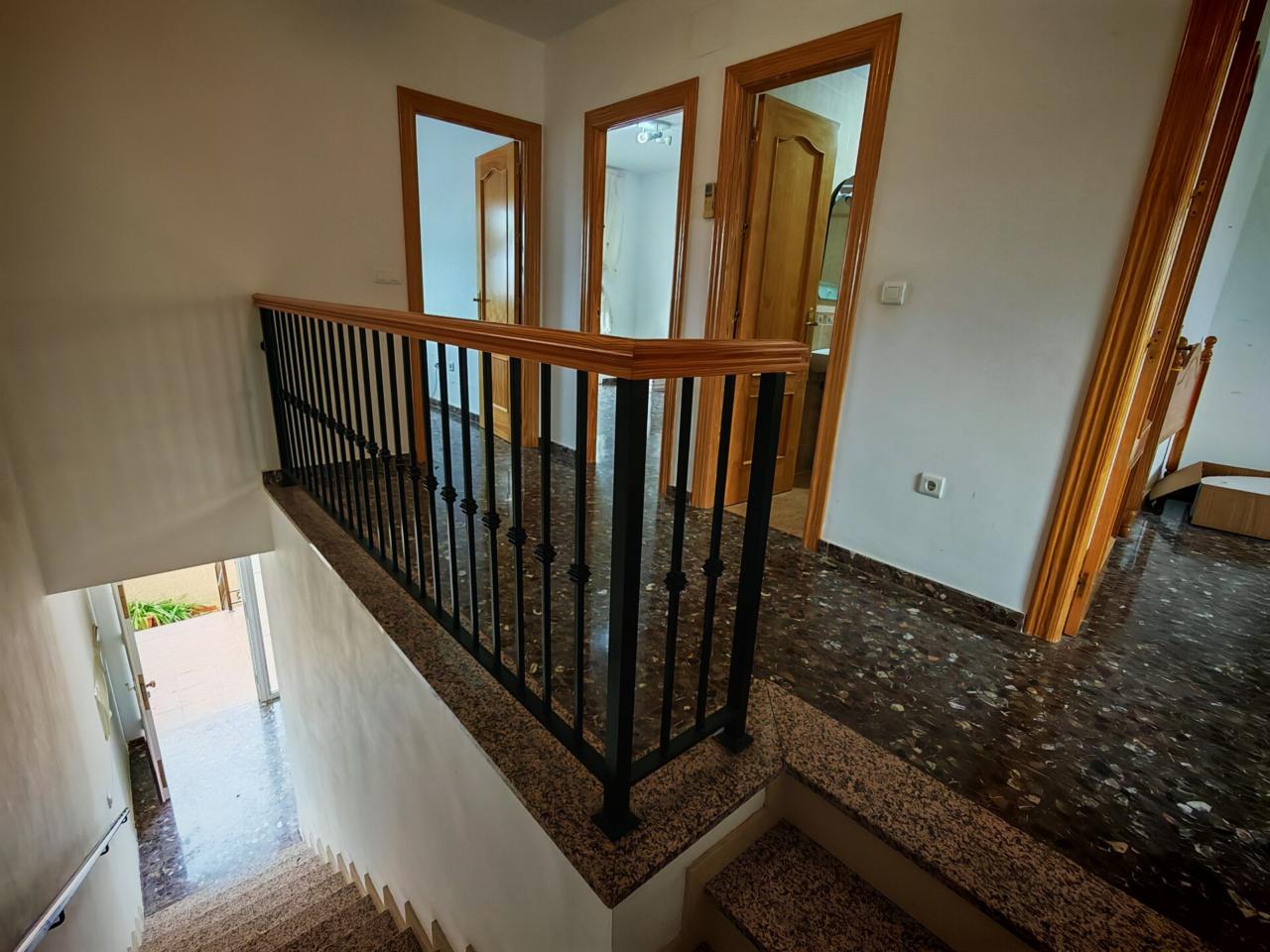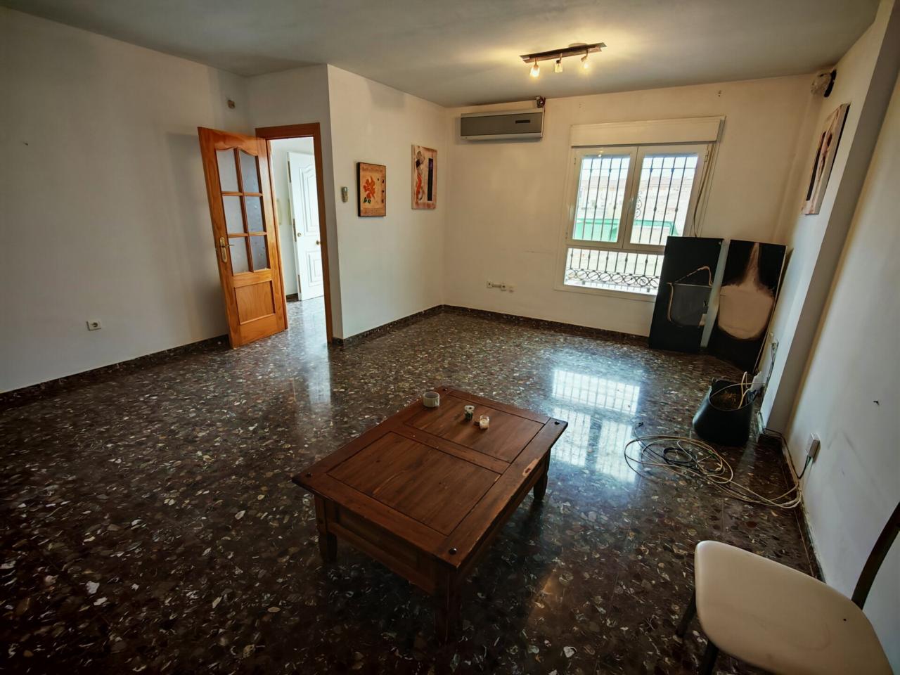 Ya en cuanto a la vivienda accedemos por porche delantero con terraza en la entrada, pasamos a recibidor con puerta separando el salon que cuenta con aire acondicionado y ventana frontal y con unas muy buenas dimensiones, junto al salon tenemos un baño completo con plato de ducha para la planta baja, puerta de acceso al semisotano y una amplia cocina amueblada y con encimera de granito y salida a lavadero que nos da acceso tambien a terraza y gran patio trasero que se prolonga hasta la carretera principal con porton de acceso.