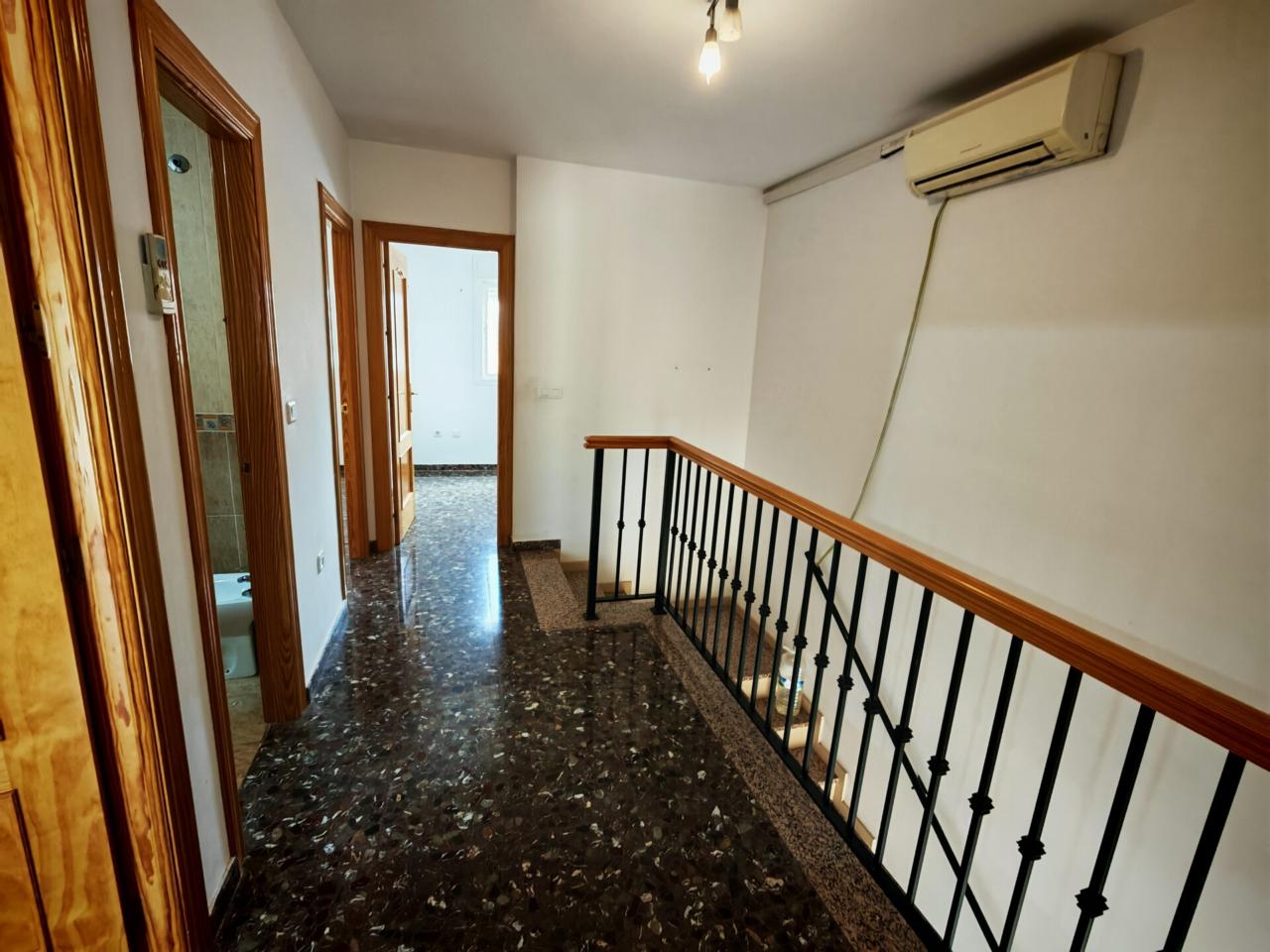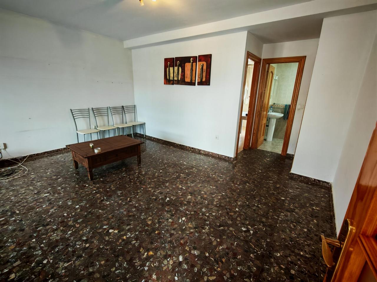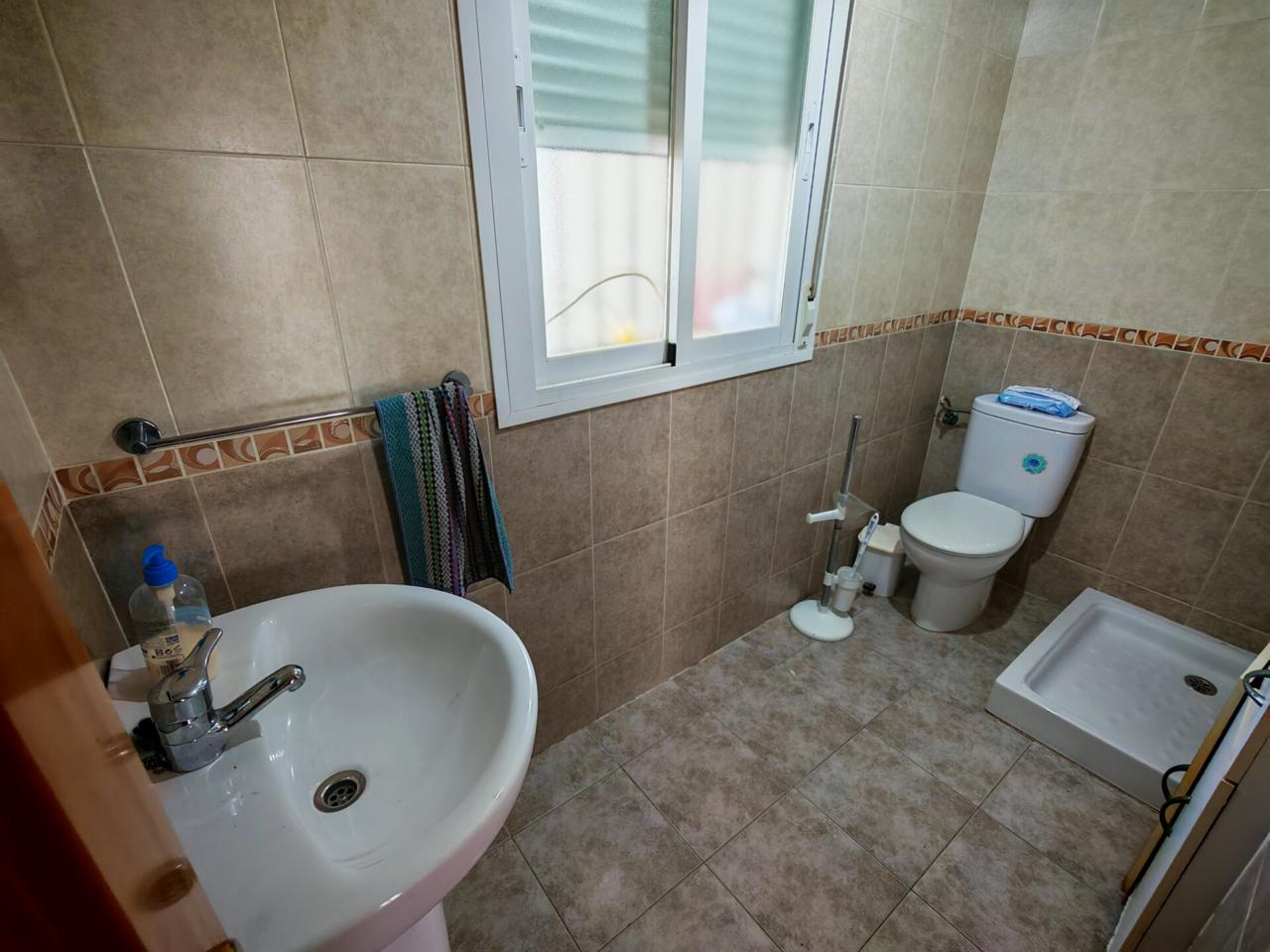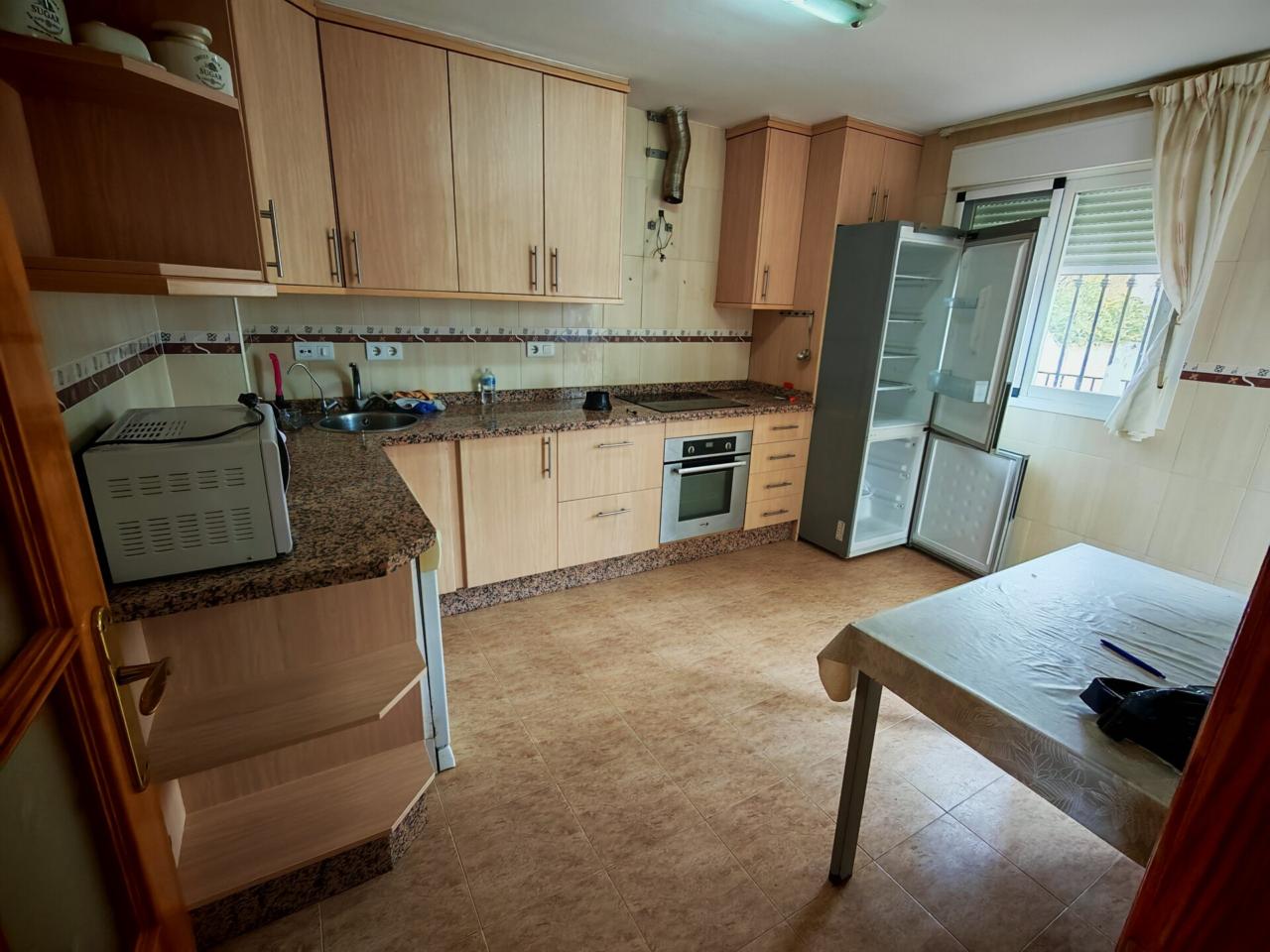 Ya en cuanto a la vivienda accedemos por porche delantero con terraza en la entrada, pasamos a recibidor con puerta separando el salon que cuenta con aire acondicionado y ventana frontal y con unas muy buenas dimensiones, junto al salon tenemos un baño completo con plato de ducha para la planta baja, puerta de acceso al semisotano y una amplia cocina amueblada y con encimera de granito y salida a lavadero que nos da acceso tambien a terraza y gran patio trasero que se prolonga hasta la carretera principal con porton de acceso.