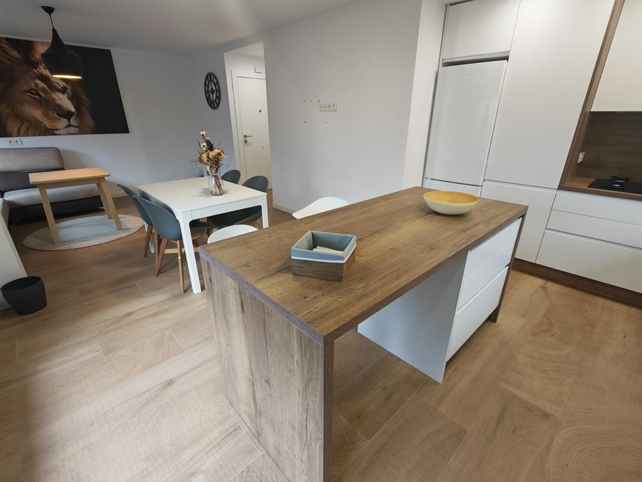 Al acceder a la vivienda encontramos un amplio salón-cocina de concepto abierto, un espacio diáfano, luminoso y muy acogedor, ideal tanto para la vida diaria como para reuniones con familiares y amigos. La cocina, de estilo moderno, está completamente equipada con mobiliario de gran capacidad y electrodomésticos, además de una gran isla central que nos aporta espacio extra de trabajo y disponemos de salida gran balcon con vistas despejadas con espadio suficiente para sentarnos y donde tambien se aloja el lavadero y zona de almacenaje extra.